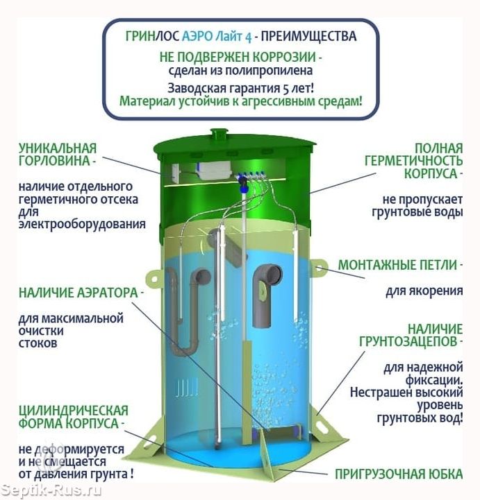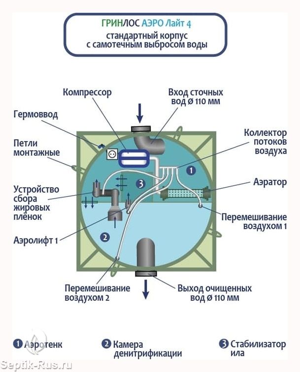 Модификация Гринлос Аэро Лайт 4 выступает менее затратной в изготовлении и эксплуатации относительно септика Аэро .