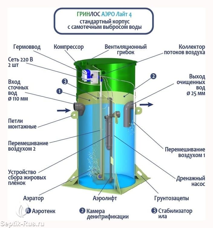 Станция Биологической Очистки Гринлос Аэро Лайт 4 предназначены для расщепления и переработки основных органических загрязнений, содержащихся в бытовых сточных водах. Эти процессы происходят в результате жизнедеятельности аэробных микроорганизмов, условия для жизнедеятельности которых создает септик.