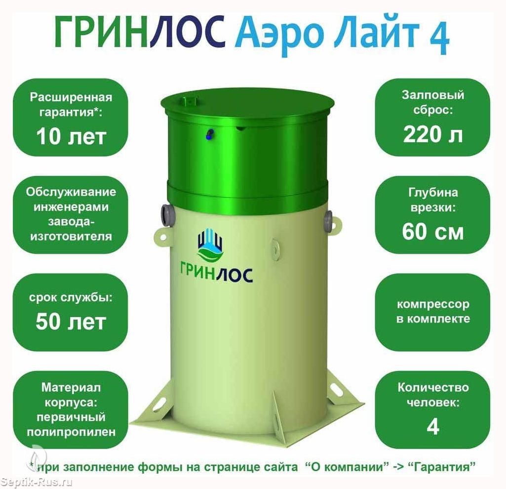 Доставим и установим септик Гринлос Аэро Лайт 4 за 1 день по цене ниже конкурентов и скидкой на монтаж до 29%. Звоните!