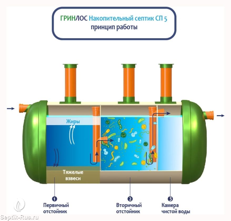 Септик обеспечивает поэтапную очистку сточных вод с разделением на фракции. Возможность использования биоферментных препаратов повышает эффективность и скорость очистки, что обеспечивает быструю обработку и отведение очищенных стоков.