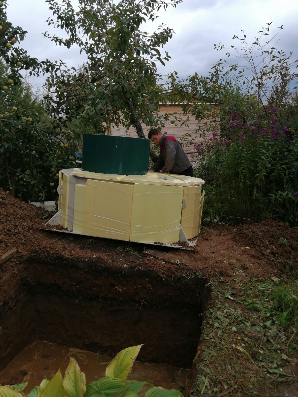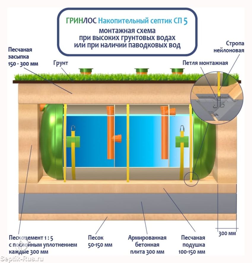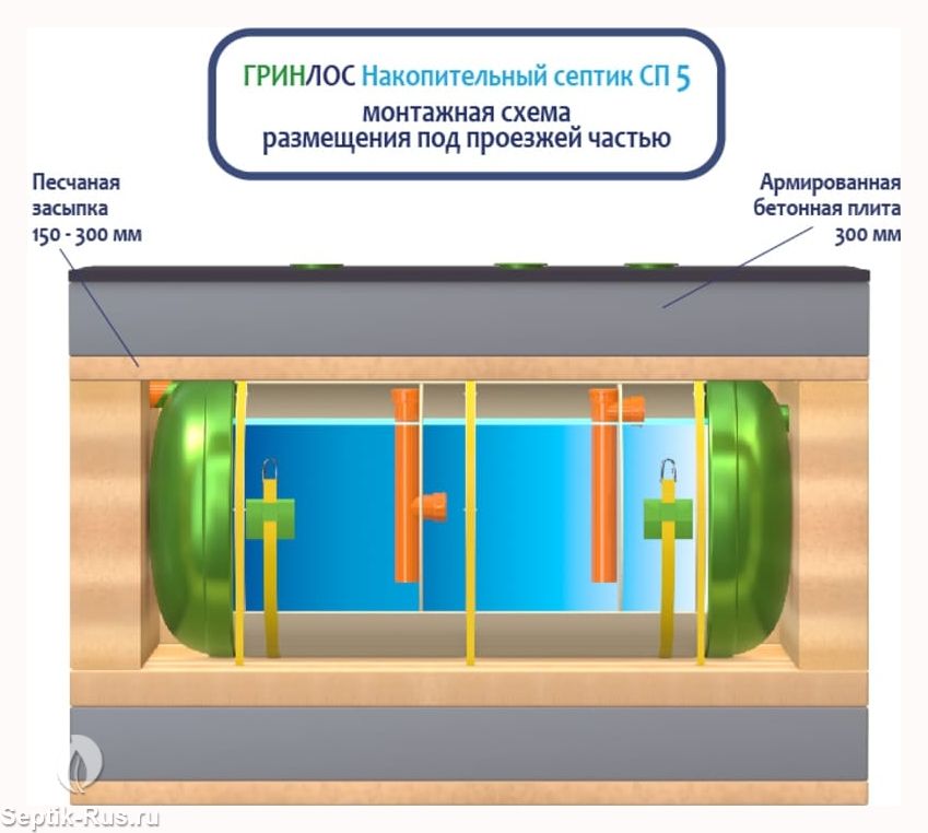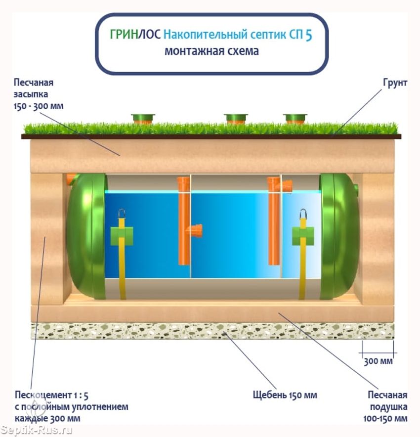 Поверх корпуса оборудования насыпается песчаный слой высотой 150-300 мм. Для подключения оборудования к внутренней канализационной системе используются предназначенные для этого канализационные трубы.