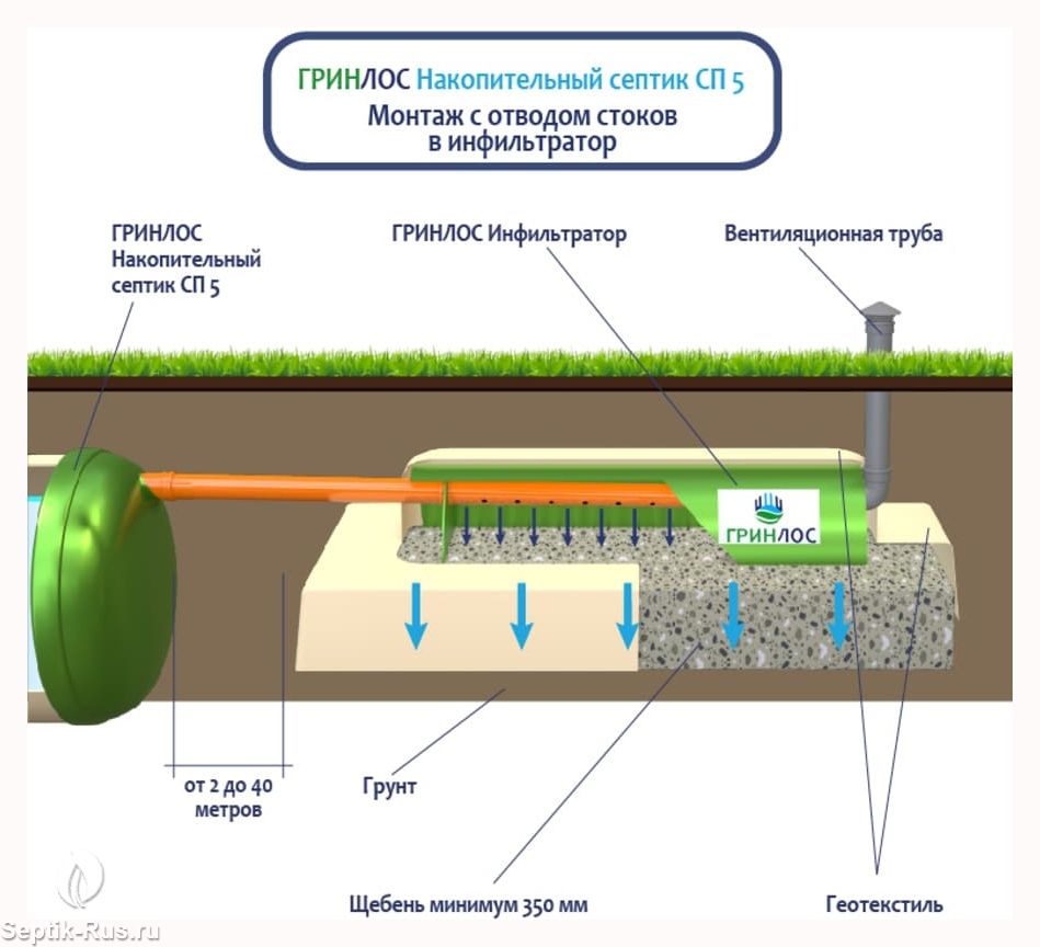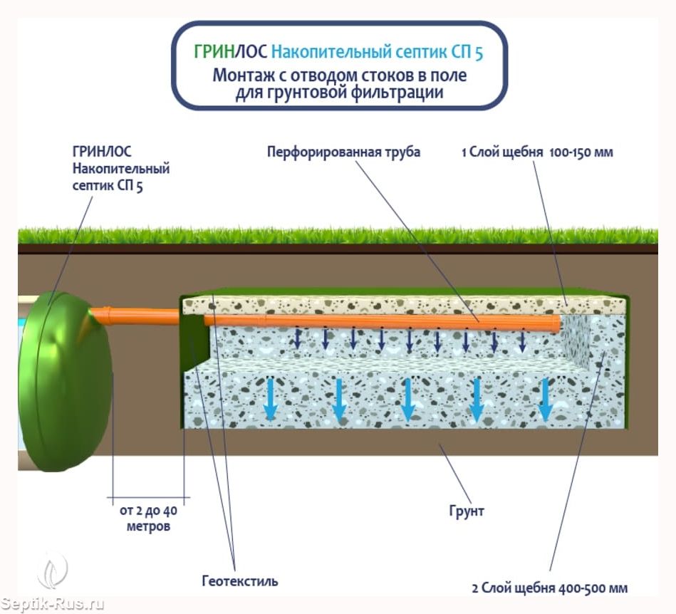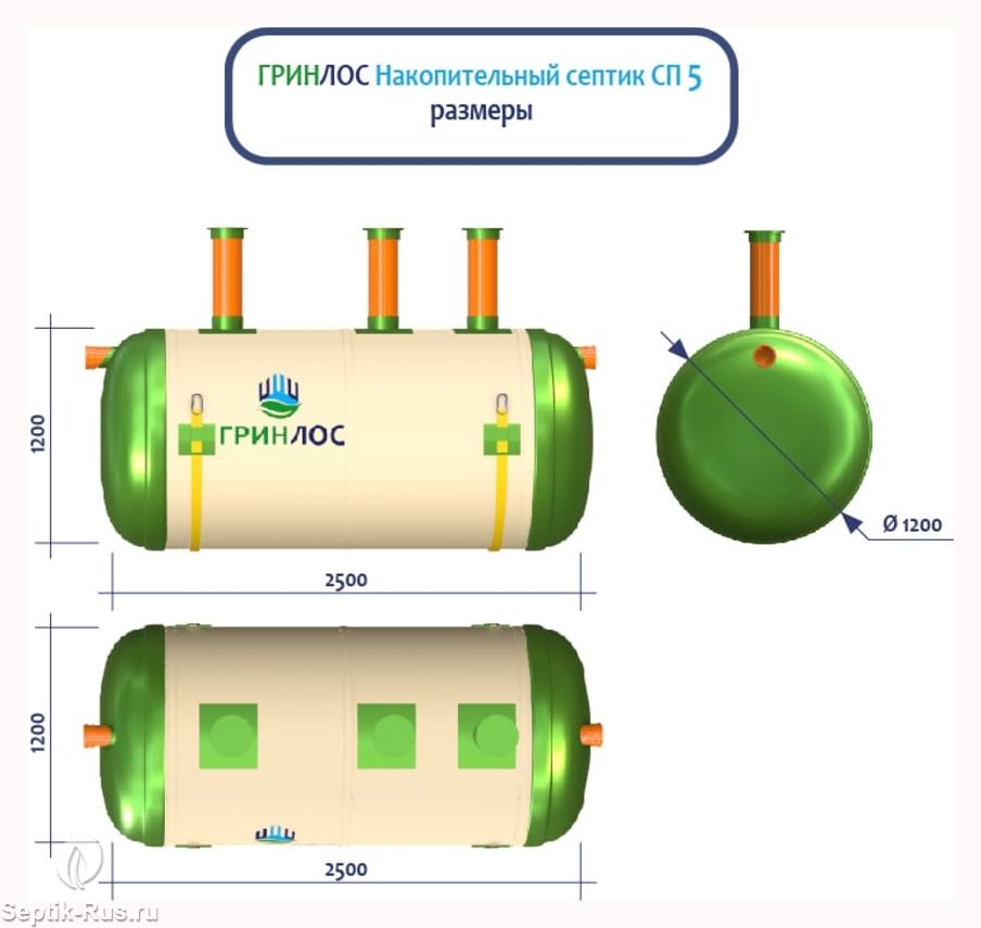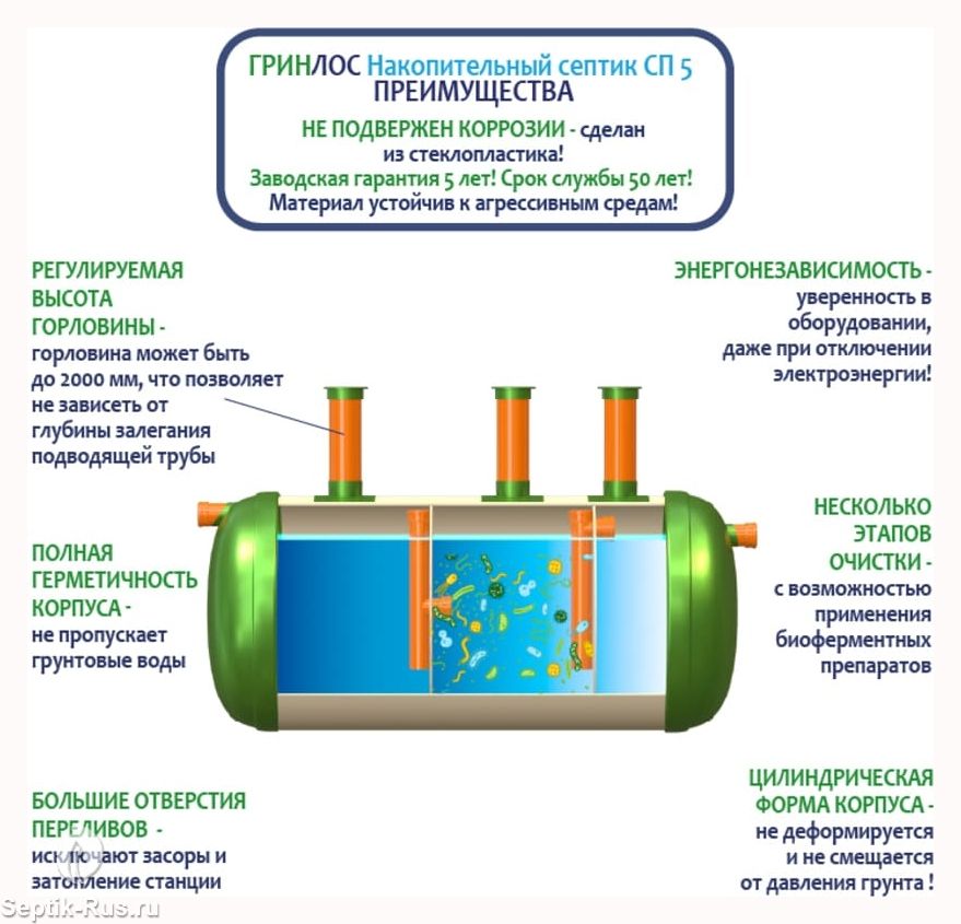 Герметичная конструкция Гринлос Накопительного септика СП 5 исключает трещины и разгерметизацию, защищая окружающую среду и здоровье людей. Грунт и подземные воды надежно защищены от загрязнений, предотвращая неприятные запахи и попадание вредных веществ.