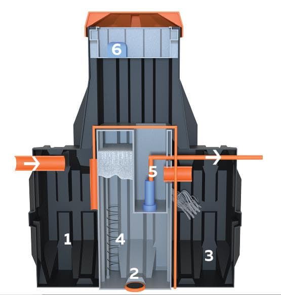 Станции глубокой биологической очистки ЭРГОБОКС делятся на два типа: самотечные (S) и с принудительным выбросом (PR). В самотечной станции сточные воды естественным путем проходят через установку от входа до выхода и далее в систему водоотведения. В станции с принудительным выбросом очищенная вода собирается в блоке экспертизы очистки воды, а оттуда выбрасывается насосом.